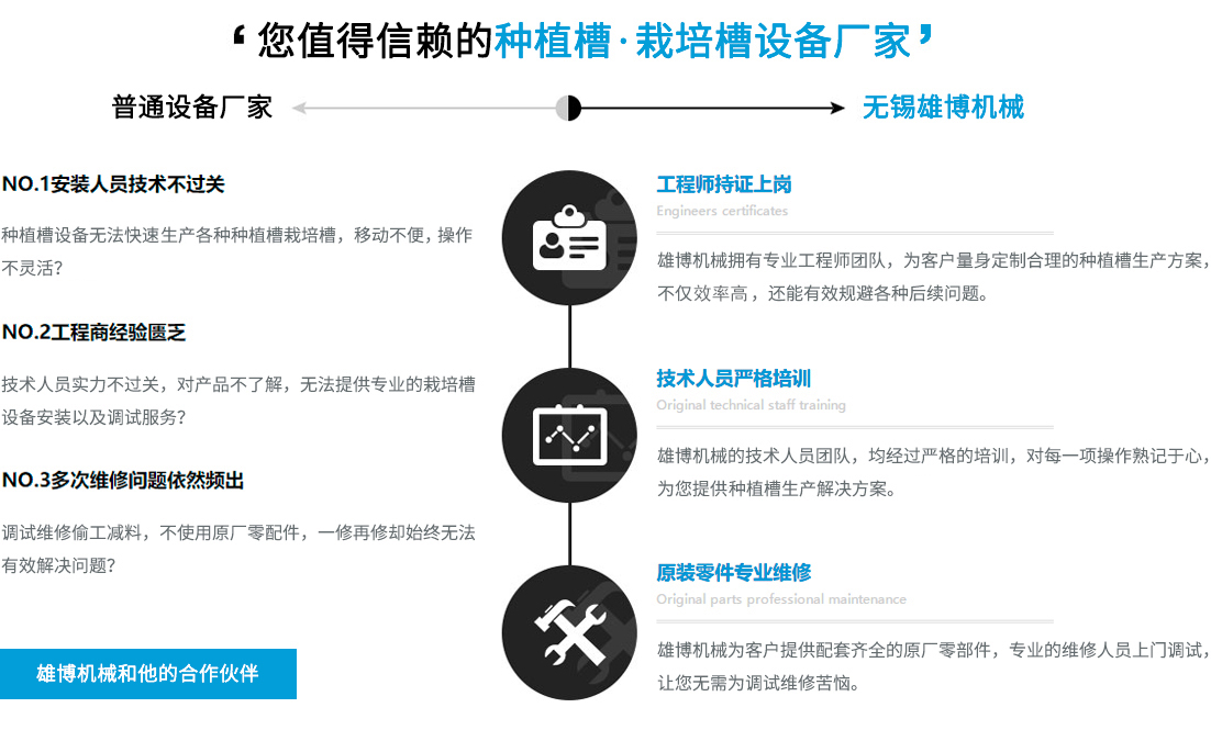 您在選擇雄博產(chǎn)品的同時(shí),也選擇無(wú)微不至的終身服務(wù)。可根據(jù)不同客戶實(shí)際需求進(jìn)行種植槽設(shè)備,栽培槽設(shè)備等的特殊工藝設(shè)計(jì)制造專業(yè)一對(duì)一售前/售后/技術(shù)咨詢指導(dǎo),享受更貼心/放心的設(shè)備使用體驗(yàn)。